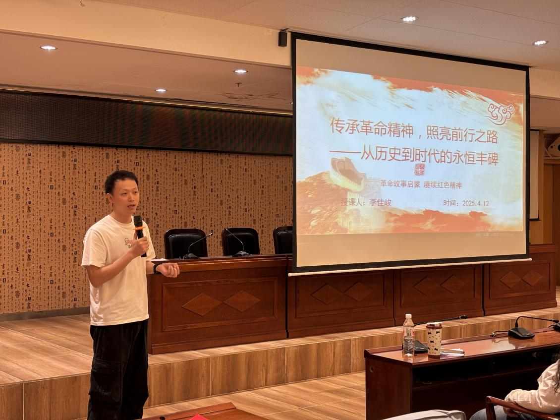 4月12日上午,研究生党员李佳峻以“传承革命精神,照亮前行之路—从历史到时代的永恒丰碑”为主题,带领学员回顾了中国共产党波澜壮阔的发展历程,深入解读井冈山精神、延安精神、长征精神的深刻内涵,激励在场同志坚定理想信念,弘扬革命精神,在新时代奋勇前行。