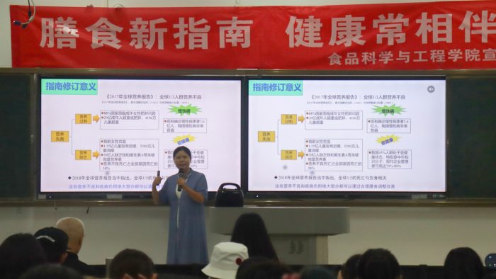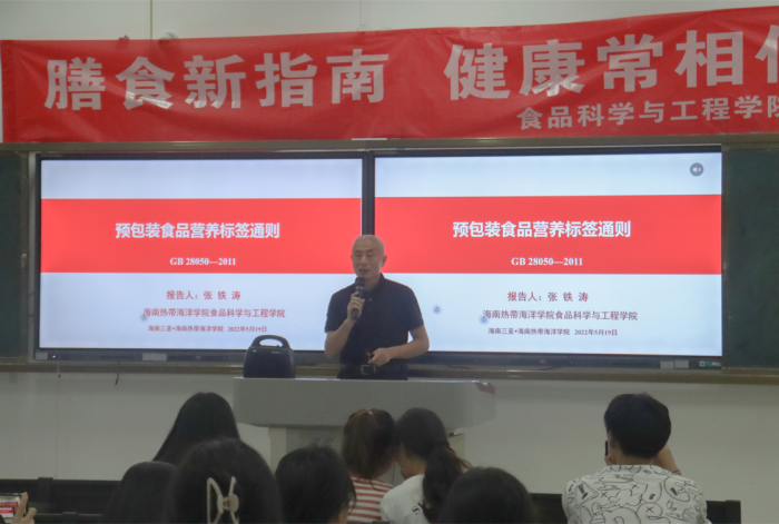 明陞m88官方网站2022年5月19日,在三亚校区举办2022年全民营养周主题讲座系列。公司副经理胡亚芹教授开展《中国居民 膳食指南2022》主题讲座,指出2022年新版的中国居民膳食指南最新变化,提出食物多样,合理搭配;吃动平衡,健康体重;多吃蔬果、奶类、全谷、大豆;适量吃鱼、禽、蛋、瘦肉;少盐少油,控糖限酒;规律进餐,足量饮水;会烹会选,会看标签;公筷分餐,杜绝浪费等八项基本准则。公司副经理张铁涛教授开展《预包装食品营养标签通则》主题讲座,主要讲解GB7718-2011和GB28050-2011,从相关术语、应用实例、营养推荐三个方面,预食品营养标签的相关知识,并通过营养成分中NRV(营养素参考值)、能量计算案例与现场同学互动,让员工积极参与,提高员工的工程素养。5月20日,在公司第一食堂,向广大师生发放膳食营养和食品标签宣传折页、手册,传播主题为“会烹会选会看标签”,宣传“健康中国、营养先行”膳食新指南。并通过多媒体展示、云端会议等线上方式向居民普及健康饮食知识,提升全民健康意识。