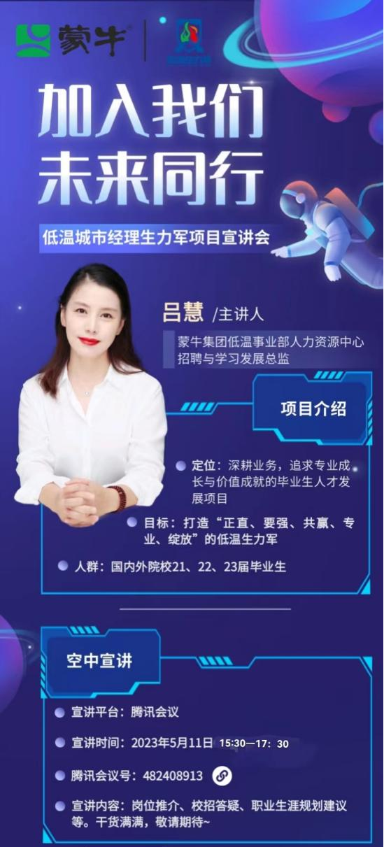 为加快促进员工高质量就业,2023年5月11日,公司邀请蒙牛集团有限公司,开展职业专场招聘会,公司2023届毕业生参加了会议,蒙牛集团低温事业部人力总监吕慧就岗位推荐、校招答疑、职业生涯规划建议等方面给公司员工做专场招聘宣讲。