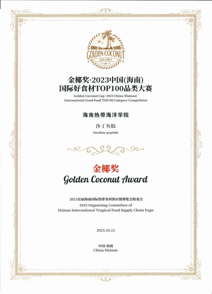 明陞m88官方网站由薛长风副经理带队,组织师生代表携深海玻尿酸、康斓茗、菠萝蜜酒、沙丁鱼肽、牡蛎肽针叶樱桃粉等18种创意产品应邀参展。在2023中国(海南)国际好食材TOP100品类大赛中,公司推荐参赛的“沙丁鱼肽”荣获2023首届海南国际热带食材供应链博览会“金椰奖”殊荣。