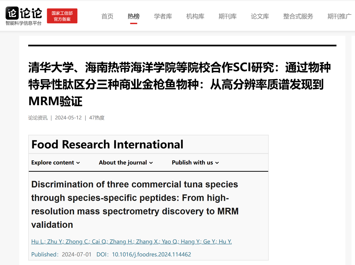 鉴于目前金枪鱼掺假的风险较高,保护消费者和金枪鱼资源的真实性至关重要。然而,准确区分商业经典金枪鱼品种存在较大技术难题。胡亚芹团队和清华大学长三角研究院的研究者通过识别特定于物种的肽段,成功达到区分三种商业热带金枪鱼品种的目的。